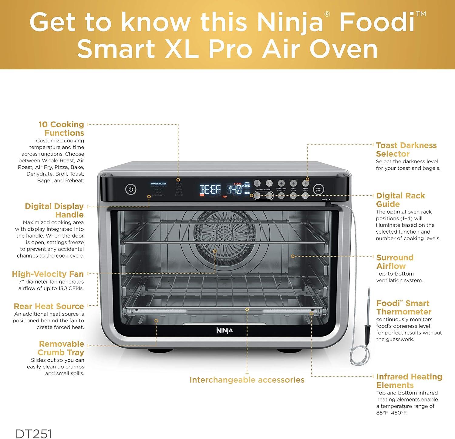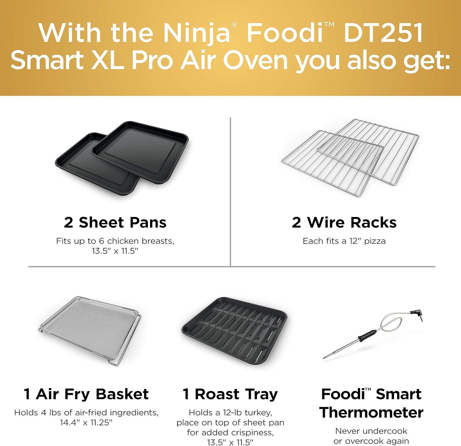 Ninja Air Fryer & Toaster Oven | Prestige Smart XL Countertop Oven | Bakes up to 20 Cookies, Fits up to a 12lb Turkey | Pizza, Toast, Bake, Air Fry & Reheat | 1800 Watts | Stainless Steel | DT501​(10-in-1 with Thermometer)