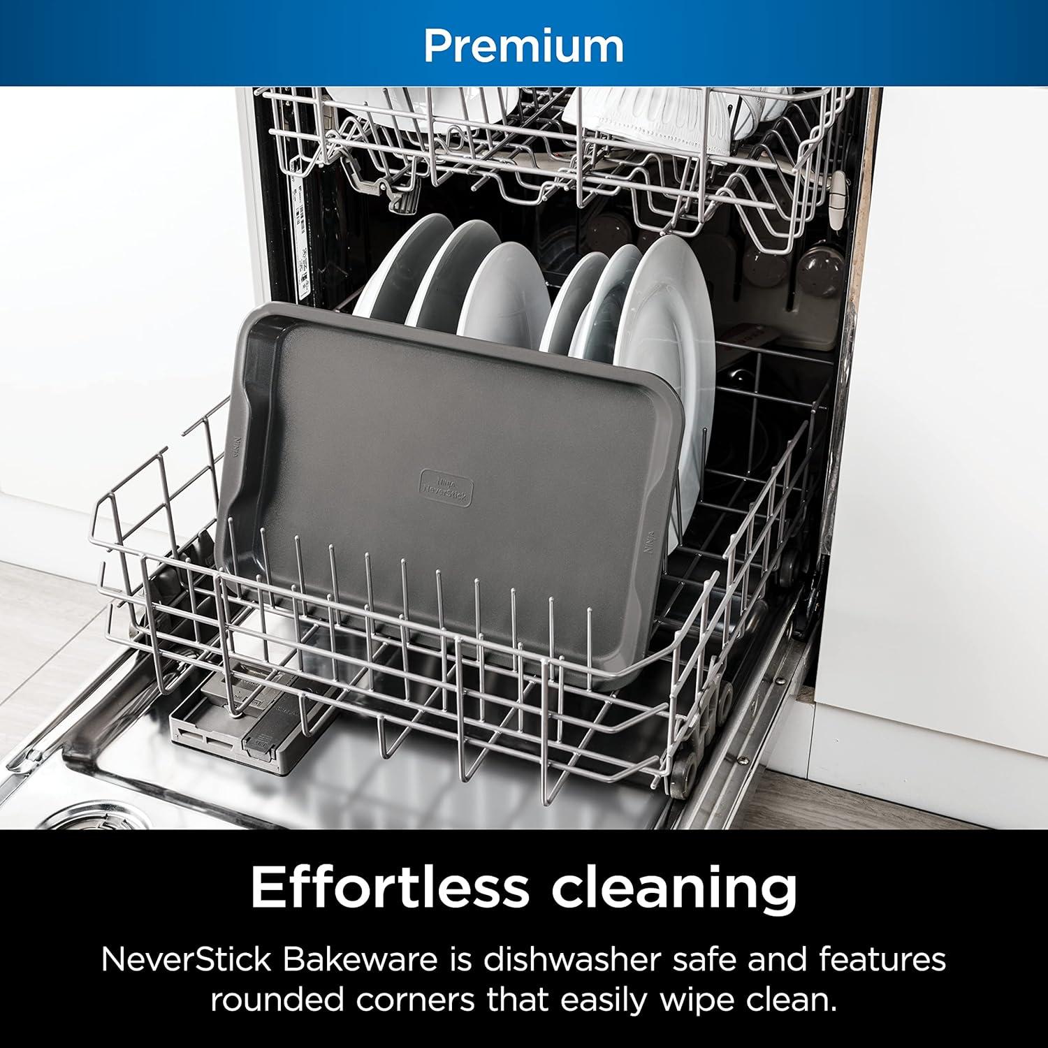 EASY CLEANUP: NeverStick Bakeware is dishwasher safe and features rounded corners that easily wipe clean.
