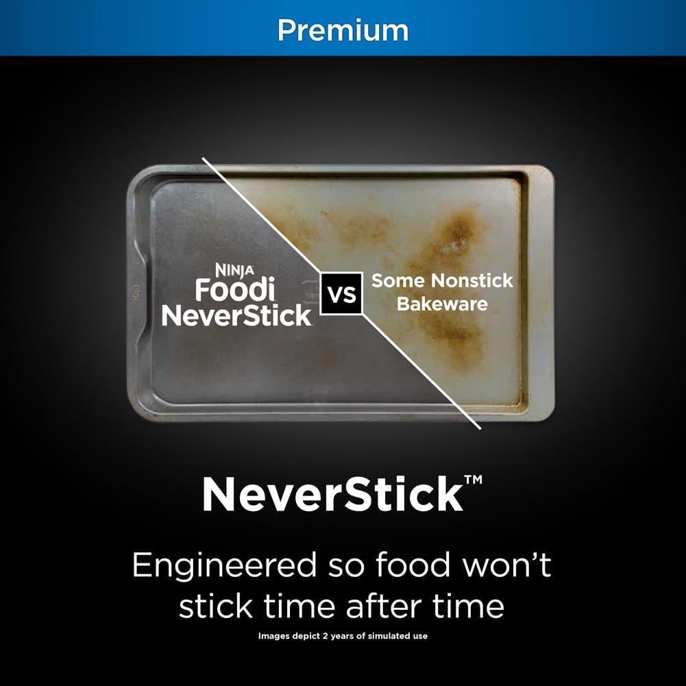Introducing the Ninja Foodi NeverStick 2-Piece Baking Sheet Set, the premium bakeware that easily releases food and wipes clean. Heavy gauge 0.8mm aluminized steel minimizes rusting, resists warping, and is oven safe up to 500⁰F. The NeverStick coating easily wipes clean, is dishwasher safe, and delivers perfect results every time.