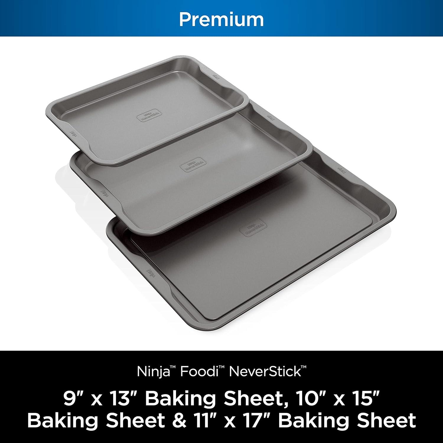 Ninja B32002 Foodi NeverStick Premium 2-Piece Baking Sheet Set, Nonstick, Oven Safe up to 500⁰F, with 9 x 13 inch Sheet & 11 x 17 inch Sheet, Dishwasher Safe, Grey(Triple Pack Cookie Pans)