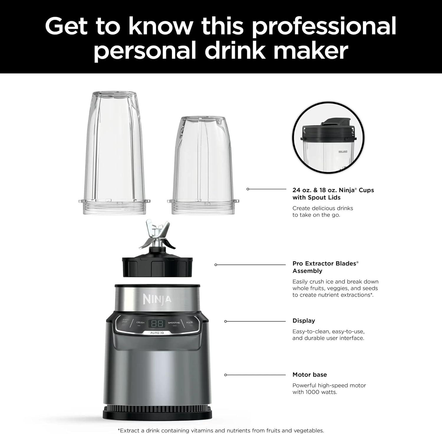 The Ninja Nutri Pro is a compact personal blender with 1000W motor power. Comes with 18oz and 24oz cups and spout lids for easy blending and on-the-go drinks. Features Nutri Ninja Pro Extractor blades to break down whole foods and frozen ingredients into nutrient-rich smoothies and shakes. Auto-iQ technology provides intelligent programs for consistent results with one touch.