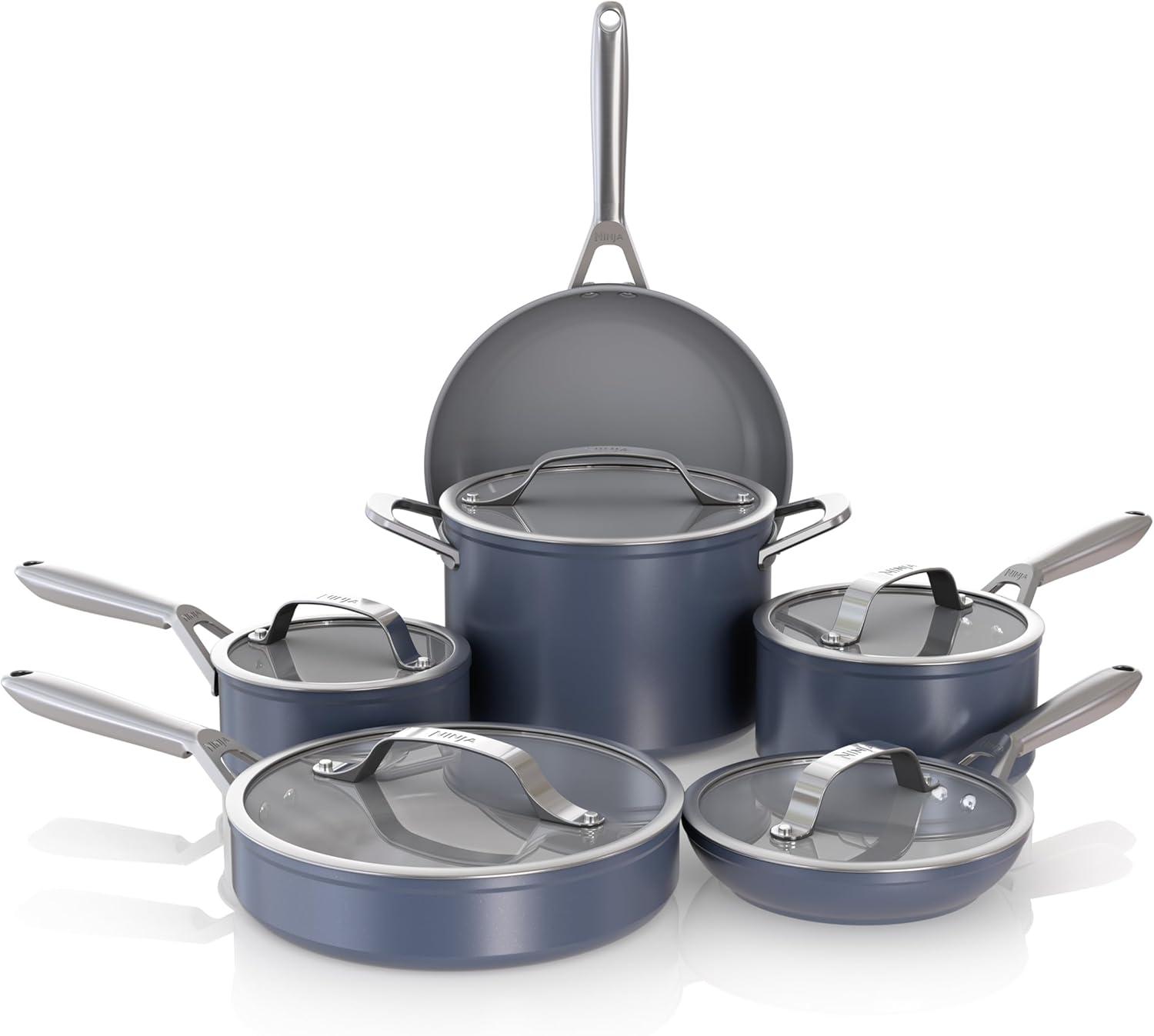 Ninja Ceramic Pro 11-Piece Cookware Set, Non-Stick Pots & Pans Set with Glass Lids, Nontoxic, PTFE Free, Ceramic Coated, Oven Safe, All Stovetops & Induction Compatible, Black, CW39011BK(Midnight Blue)