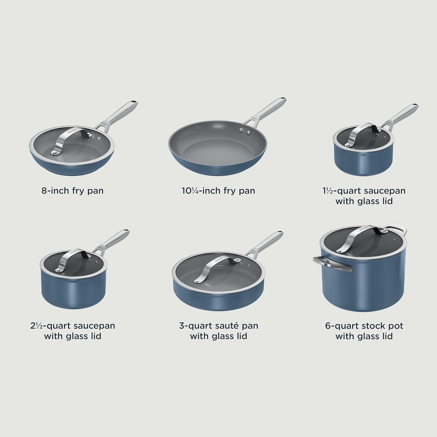 Ninja Ceramic Pro 11-Piece Cookware Set, Non-Stick Pots & Pans Set with Glass Lids, Nontoxic, PTFE Free, Ceramic Coated, Oven Safe, All Stovetops & Induction Compatible, Blue Macaron, CW39011BM(11pc-Blue Macaron)