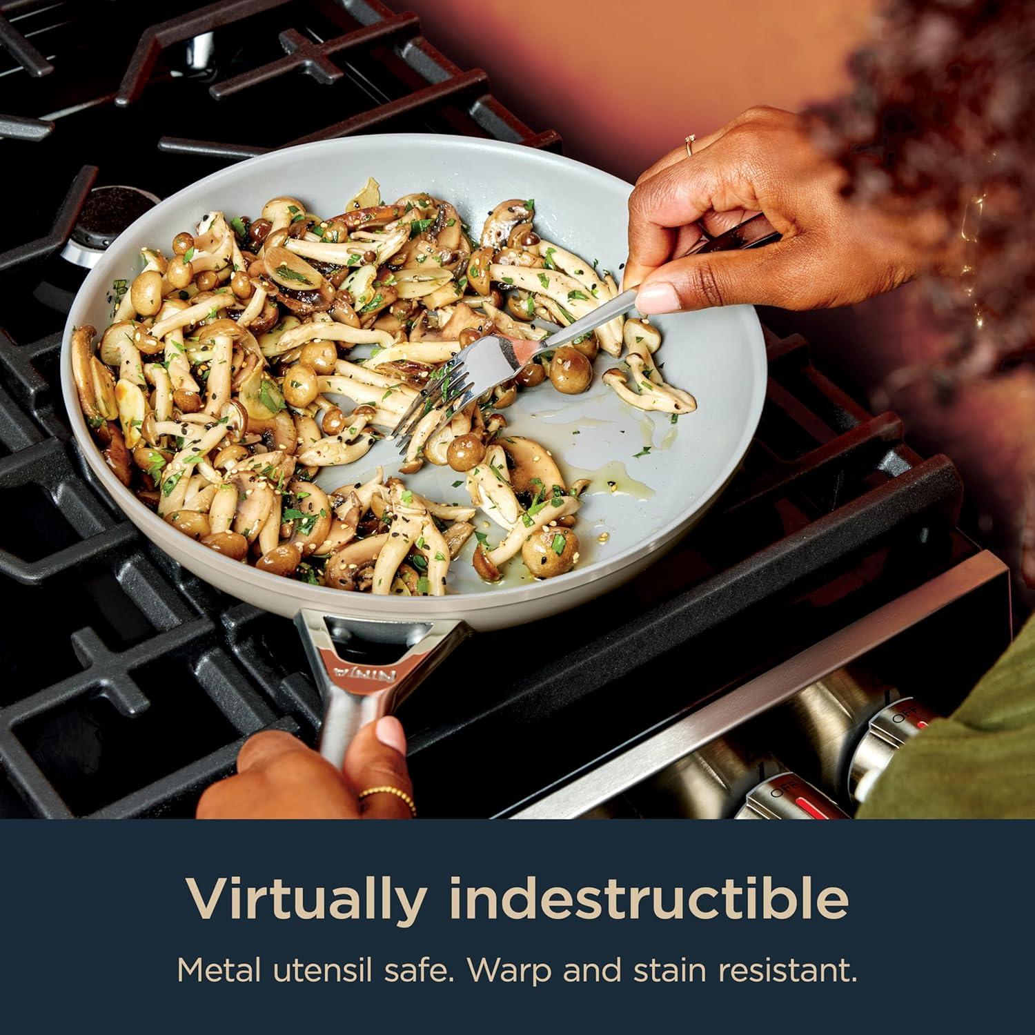 Meet the Ninja Ceramic Pro cookware made 100% PTFE free. Our Ceramic Pro Promise ensures a long-lasting, worry-free way to cook without sacrificing nonstick performance. Cook with peace of mind on a cooking surface made with no PTFE and PFOA, no heavy metals, and no hard anodization. The deeper-embedded a nonstick design unlocks the ability for you to scratch it, scrub it, or heat it much more than traditional cookware—delivering an ultra-resilient cooking surface.