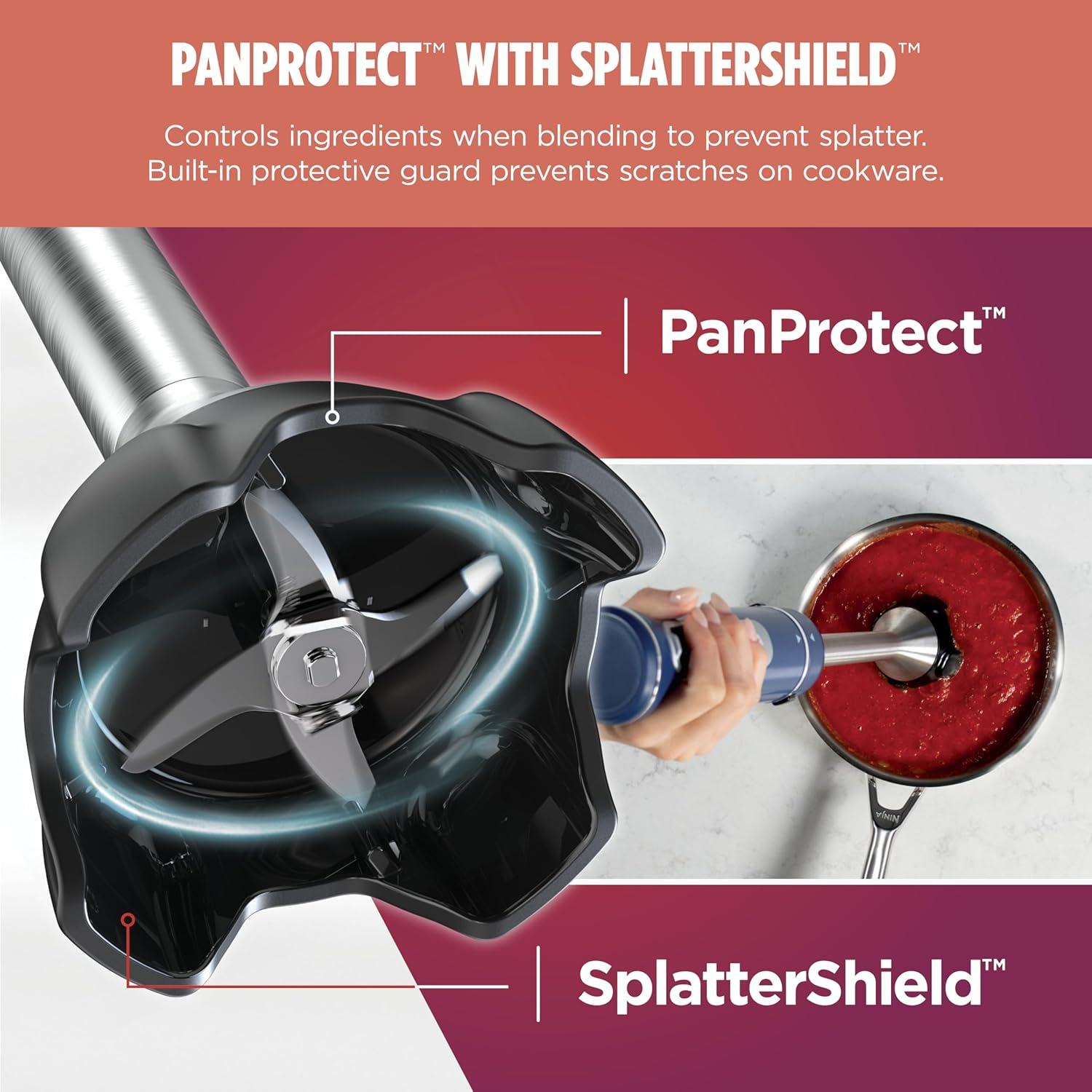 9” STAINLESS STEEL IMMERSION BLENDING ARM: Comes with built-in pan guard allowing you to blend directly in deep pots or pans without scratching them.