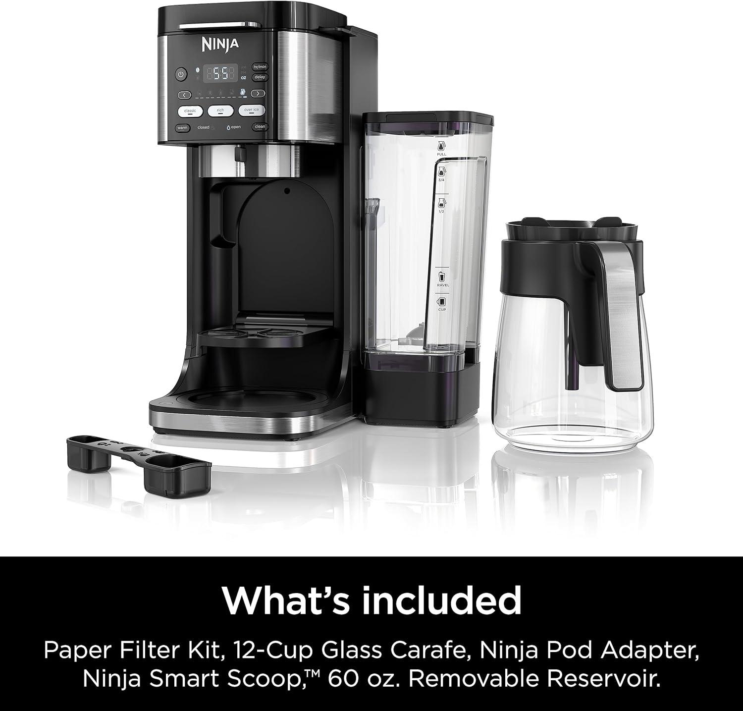 WHAT'S INCLUDED: Components include 12-Cup Glass Carafe, Ninja Smart Scoop, Ninja Pod Adapter, Paper Filter Kit, Ninja DualBrew Hot & Iced Coffee Maker
