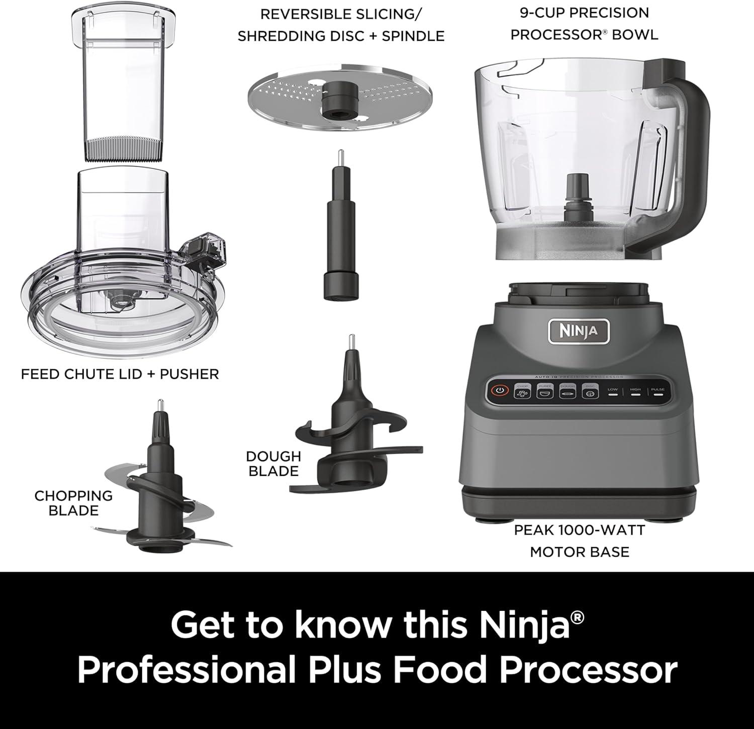 Ninja Food Processor, Professional Plus, 1000 Peak Watts, 4 Functions for Chopping, Slicing, Purees & Dough with 9-Cup Processor Bowl, 3 Blades, Food Chute & Pusher, Silver, BN601(9-Cup Food Processor)