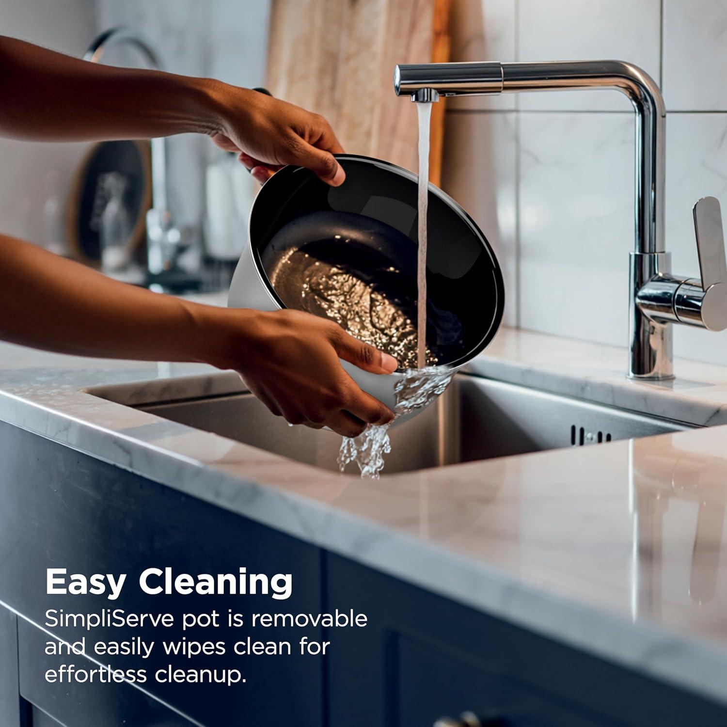 EASY TO CLEAN & MADE PFAS FREE: SimpliServe Pot is removable and features a ceramic, nonstick surface made 100% PFAS free. Designed for quick and easy maintenance—wipe away sticky foods and burnt-on residue with minimal effort.