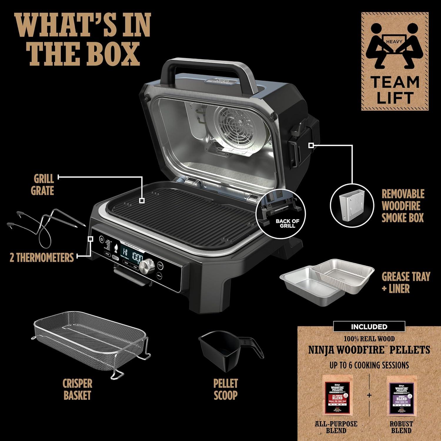 Ninja OG951 Woodfire Pro Connect Premium XL Outdoor Grill & Smoker, Bluetooth, App Enabled, 7-in-1 Master Grill, BBQ Smoker, Outdoor Air Fryer, Woodfire Technology, 2 Built-In Thermometers, Black/Blue(XL Grill+Thermometer+App Connect)