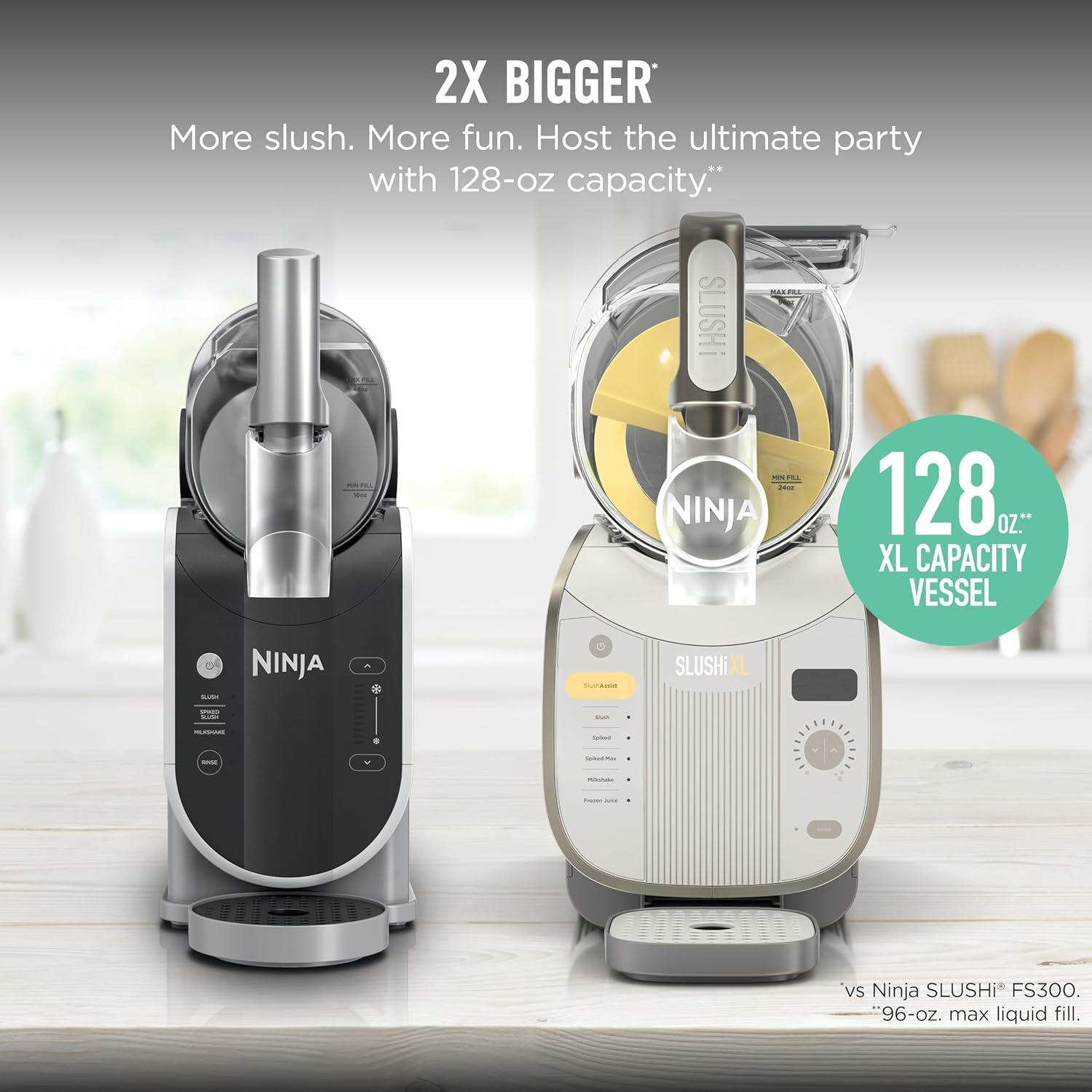 2X BIGGER*: More slush. More fun. Host the ultimate party with 150-oz. capacity**. (*vs Ninja SLUSHi FS300. **112-oz max liquid fill.)