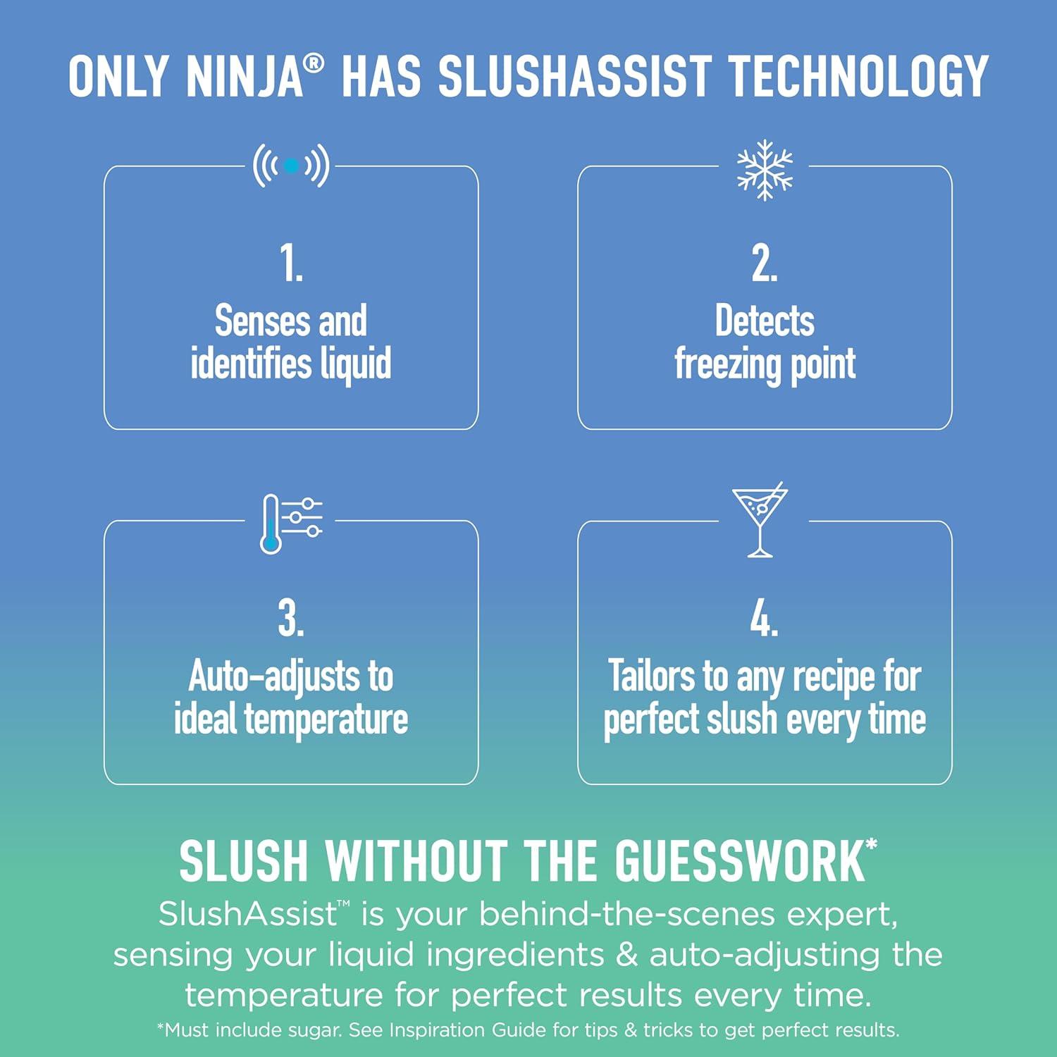 SMARTER SLUSHING WITH ZERO GUESSWORK*: NEW SlushAssist Technology senses ingredients and auto-adjusts temperature for perfect slush every time. *Compared to Ninja SLUSHi FS300.