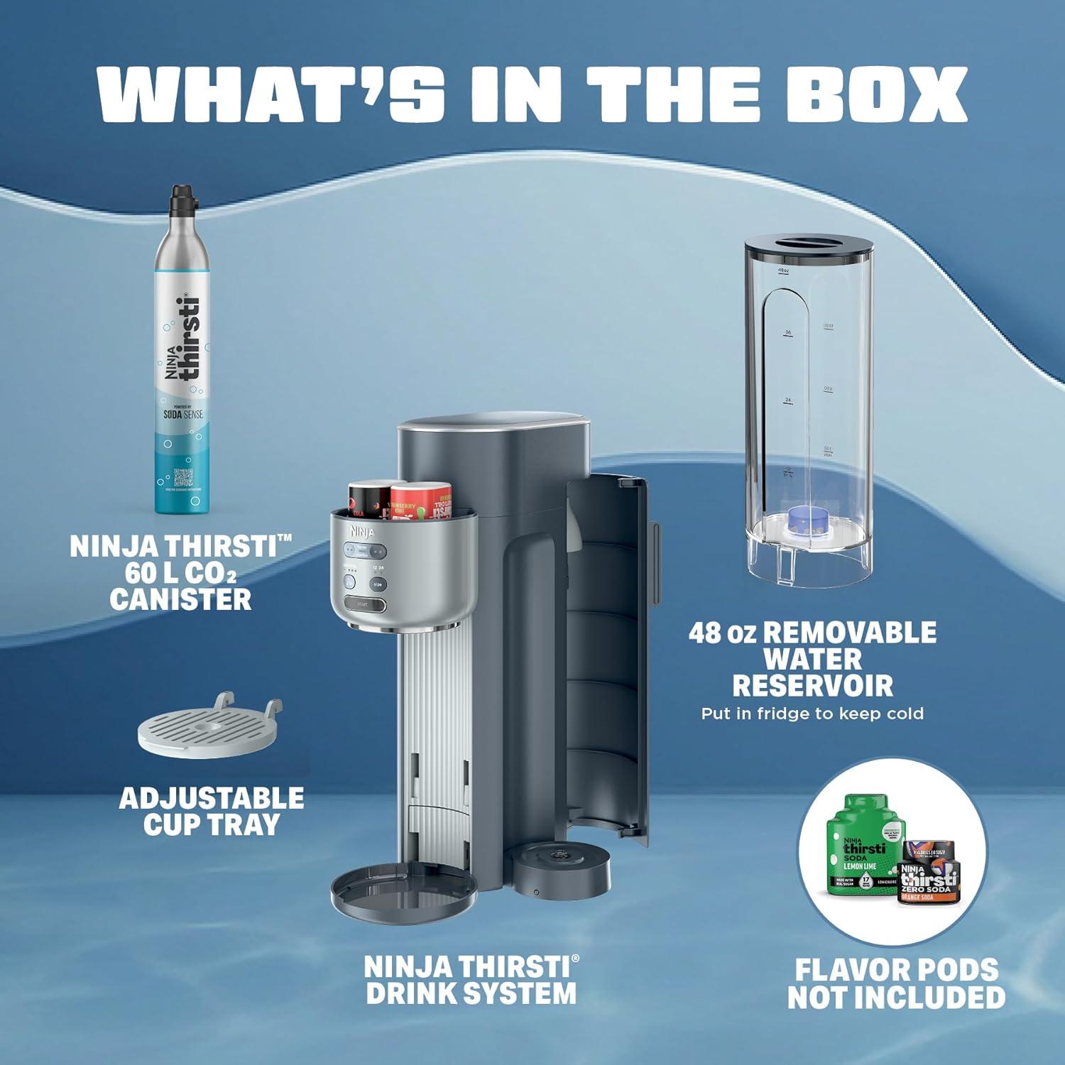 INCLUDES: Ninja Thirsti Ultimate Drink Station, 48oz Removeable Temperature Sensitive Water Reservoir, 60L CO₂ Cylinder. Flavor pods NOT INCLUDED.